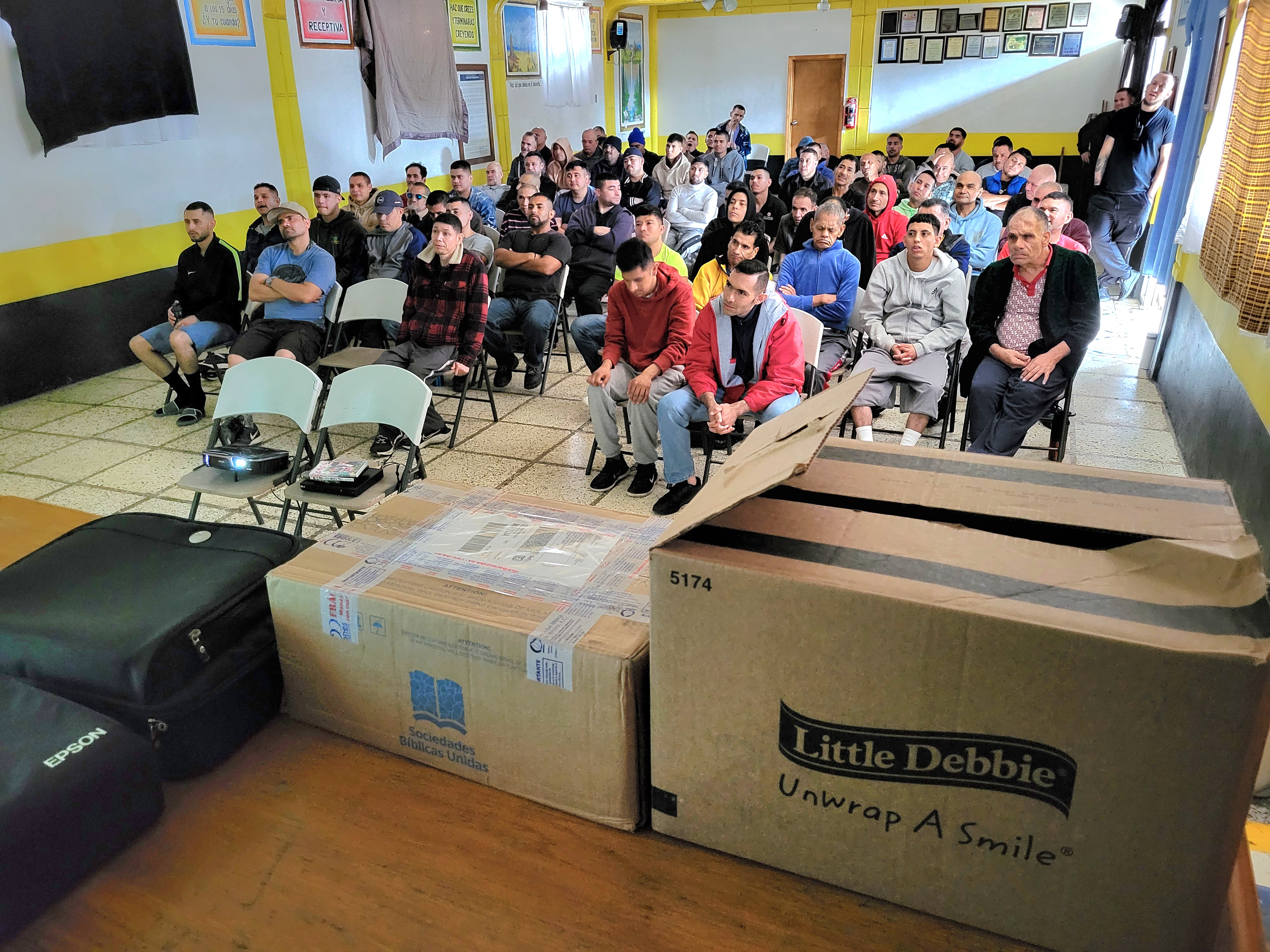 계속 이렇게 기독교 영화를 상영하여 복음을 전파하고 있습니다. 앞 주에 한 재활원에서 영화 상영을 하였습니다. 이런 재활원에서 지내는 형제들에게 계속 좋은 기독교 영화를 상영하고 있습니다.