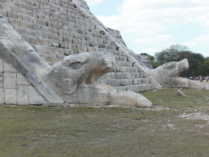 북쪽을 향하고 있는 계단 아래 부분에는 2개의 뱀 머리가 조각되어 있는데, 이것은 쿠쿨칸(Kukulcan)을 상징하고 있다.