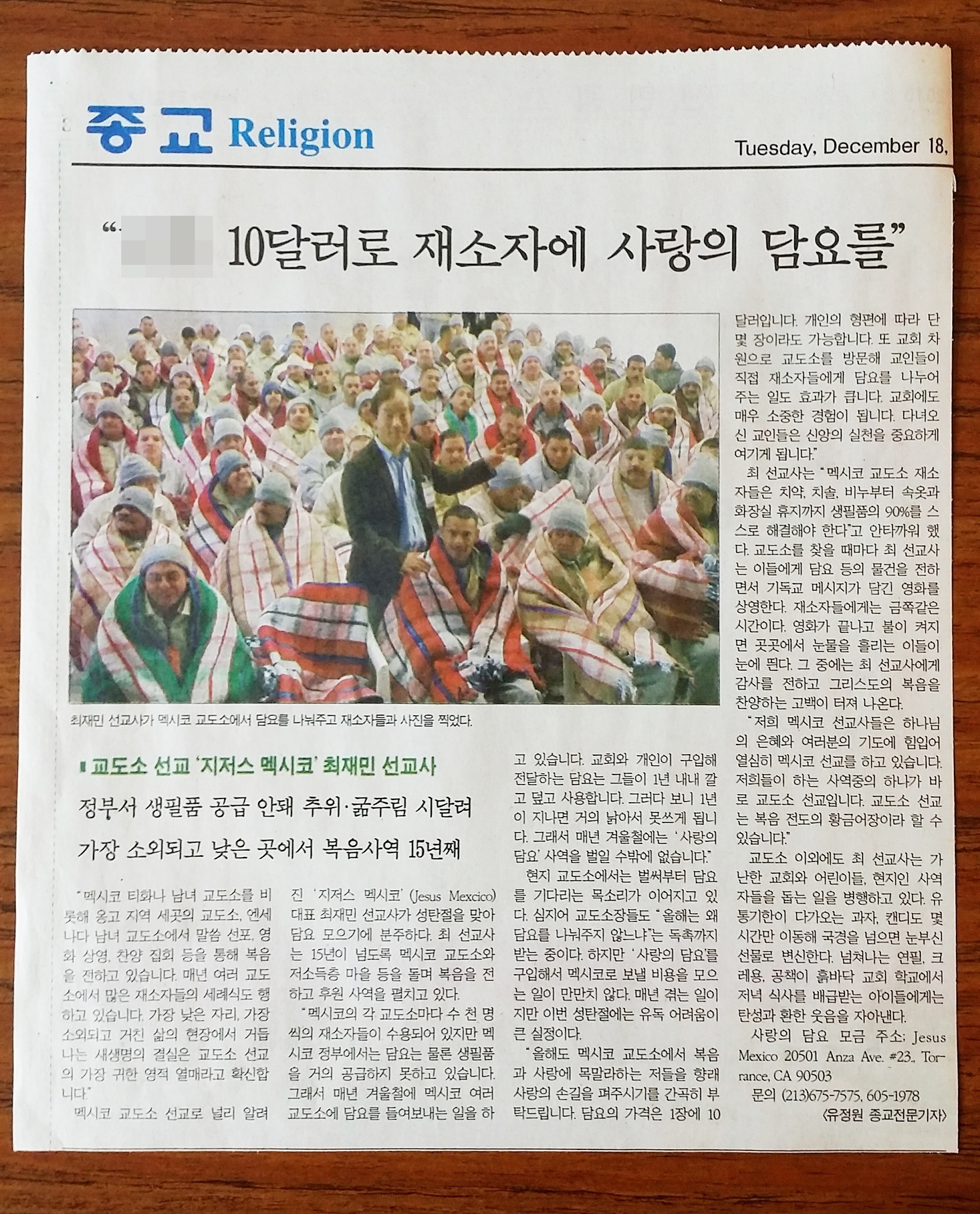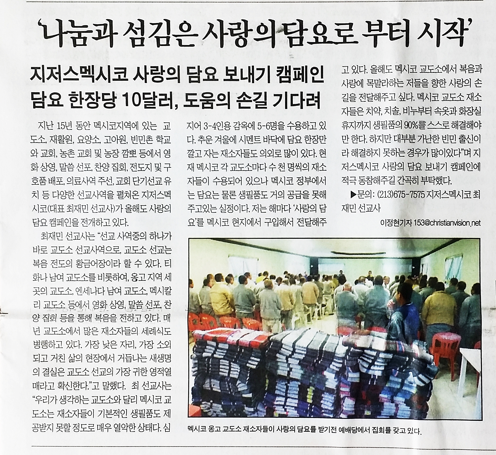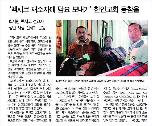 매년 겨울철에는 멕시코의 여러 교도소들에 담요를 넣어주고 있습니다. 벌써 17년째입니다. 올해도 어김없이 재소자들에게 담요를 넣어줄 것입니다. 왜 그런 일을 멕시코 정부가 안 하고 선교사가 하냐구요? 믿기 어렵겠지만 멕시코 정부는 치약이나 칫솔, 비누는 물론 화장지도 공급을 못합니다.