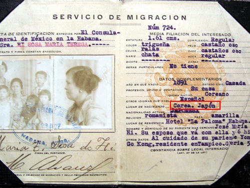 한 한인의 신분증 출생지 표기(빨간색 박스)가 Corea, Japon 즉 한국과 일본 2개가 병기되어 있다. 쿠바주재 멕시코 영사관 발행