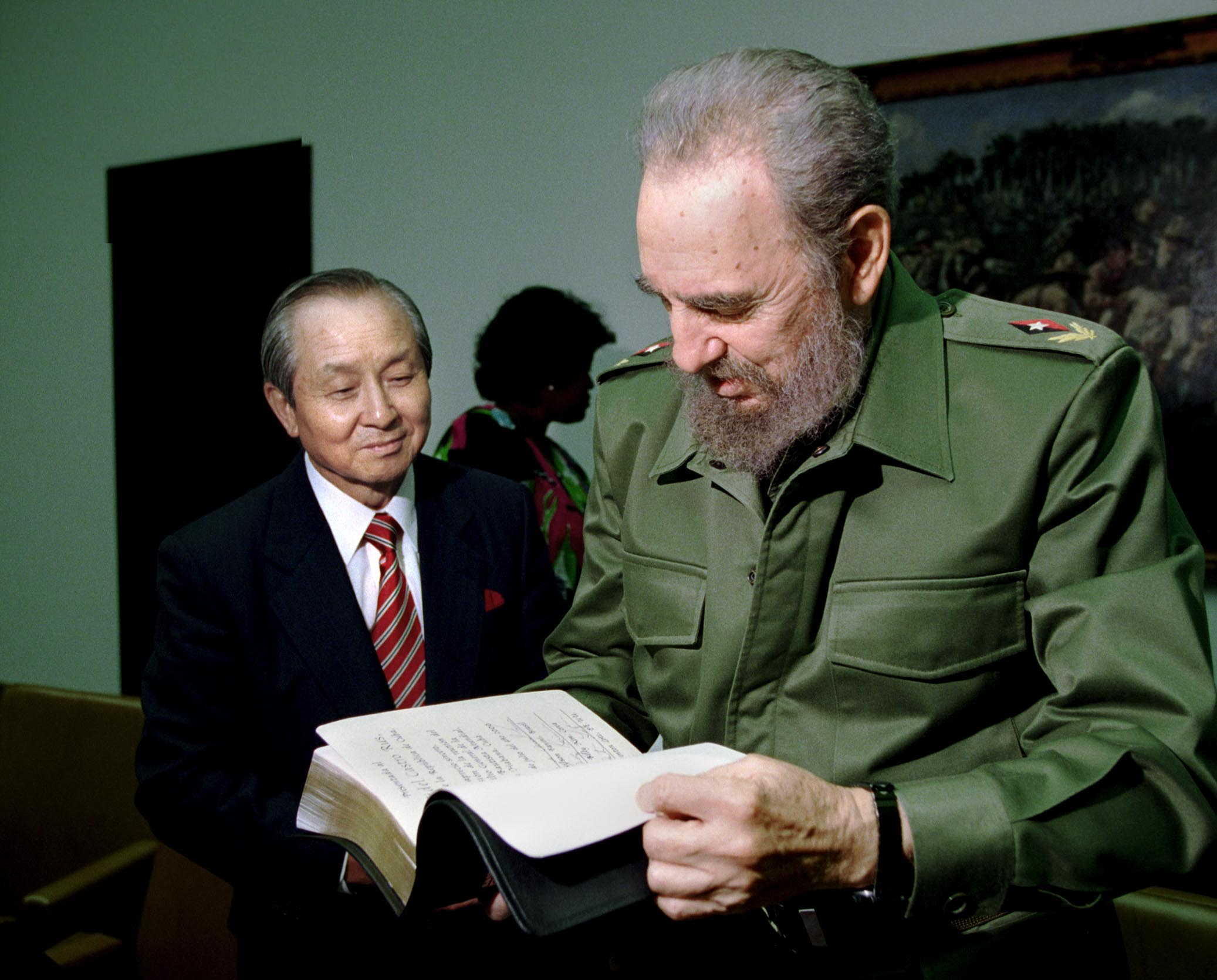 Cuba를 방문하여 Fidel Castro에게 성경책을 기증하는 김장환 목사. 2000년 1월
